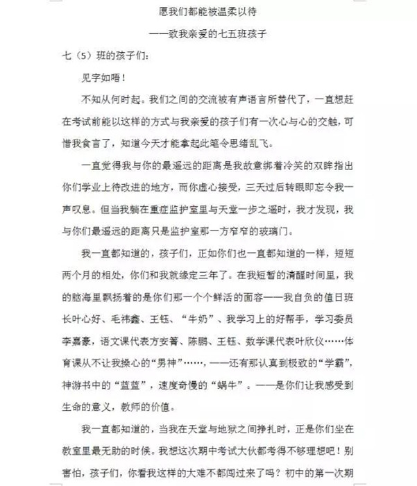 ??? 病床上,衢州華茂外國語學校的老師江峰一心記掛著學生,在手術前還親筆給班里的孩子們寫信,讓學生放心;病房外,有一群人則一直牽掛著江峰,為他研究最佳治療方案。