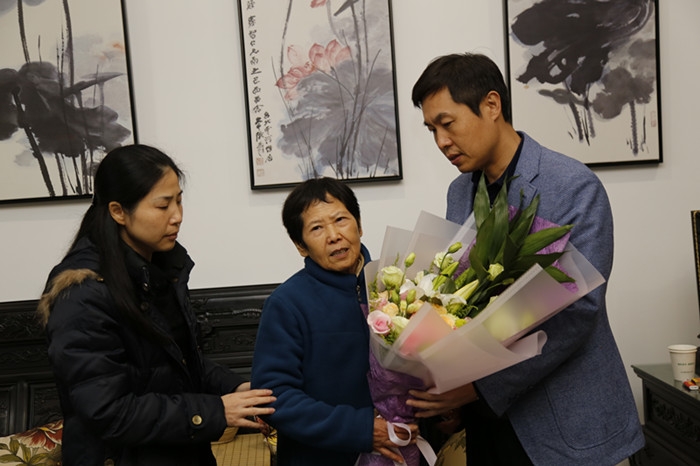 ??? 市委宣傳部副部長(zhǎng)鄭小龍向程華煜母親送上鮮花和慰問(wèn)金,與程華煜的母親和妻子親切交談。