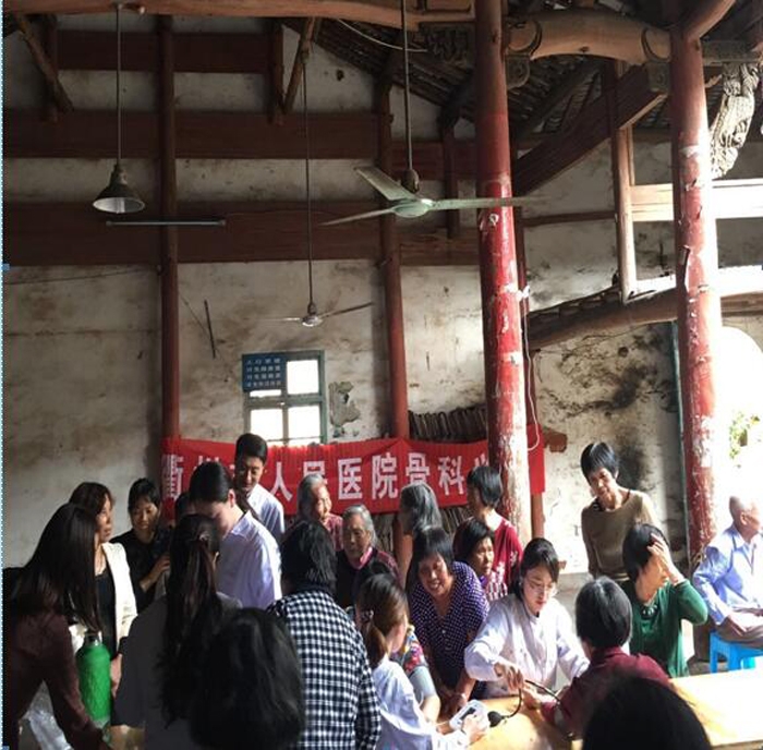 ??? 聽說有專家來了,村民們成群結(jié)隊地來到汪氏祠堂,排著長隊等候。醫(yī)護人員在現(xiàn)場耐心地給村民進行查體和講解疾病預(yù)防知識,測量血壓。同時,還向在場的鄉(xiāng)親們介紹了骨科最新開展的新項目、新資訊,并進行四肢功能鍛煉、日常保健等方面的指導(dǎo)。