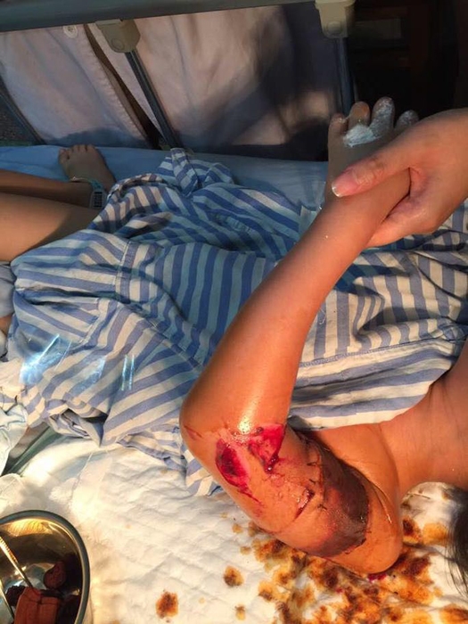 ??? 涵涵是個(gè)漂亮可愛(ài)的小女孩,平日里,她的父母在外地工作,涵涵和爺爺奶奶生活在一起。6月10日早上8點(diǎn)左右,奶奶騎著電動(dòng)車帶著涵涵出門,不幸和一輛貨車發(fā)生碰撞,祖孫倆在車禍中受傷,涵涵的左上臂遭車輪碾壓,被好心的鄰居緊急送到了我院。