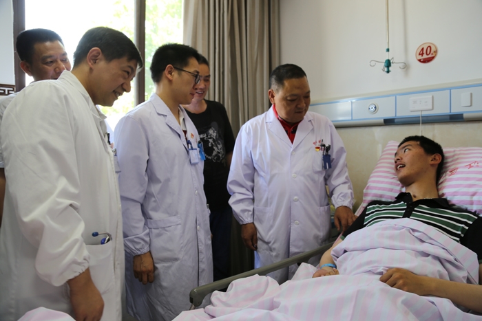 ??? 5月18日下午,衢州市衛(wèi)生計(jì)生委黨委委員、副調(diào)研員張福俊帶領(lǐng)由市人民醫(yī)院神經(jīng)外科、康復(fù)科及市第三醫(yī)院神經(jīng)內(nèi)科組成的醫(yī)療專家團(tuán)隊(duì)前往衢江區(qū)中醫(yī)院看望在此進(jìn)行康復(fù)治療的章浩杰同學(xué),市衛(wèi)生計(jì)生委黨委委員、市人民醫(yī)院黨委書記徐天才,市衛(wèi)計(jì)委醫(yī)政處處長(zhǎng)劉文勇陪同前往。