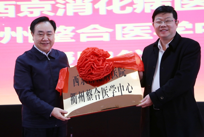 ??? 3月15日下午,第四軍醫(yī)大學(xué)西京消化病醫(yī)院衢州整合醫(yī)學(xué)中心揭牌儀式在我院五樓學(xué)術(shù)報告廳舉行。中國工程院院士、中國工程院副院長、西京消化病醫(yī)院院長、國際知名消化疾病專家樊代明與院長陳震宏共同為“西京消化病醫(yī)院衢州整合醫(yī)學(xué)中心”揭牌。