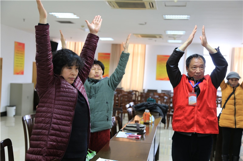 ??? 3月5日上午10點(diǎn),我院門(mén)診樓12樓會(huì)議室內(nèi),投影儀下播放著健身氣功“八段錦”的教學(xué)視頻,二十多名類(lèi)風(fēng)濕性關(guān)節(jié)炎病友正跟著視頻學(xué)做操。