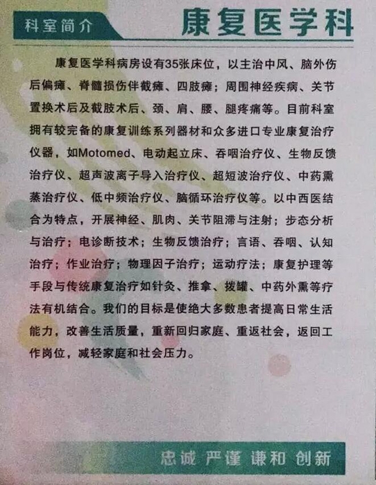 ??? 康復(fù)醫(yī)學(xué)科主要收治腦卒中、顱腦損傷后偏癱,脊髓損傷后截癱及頸肩腰腿痛等疾病。通過科學(xué)專業(yè)的康復(fù)治療能使偏癱或截癱患者早日脫離床上生活,提高日常生活能力。