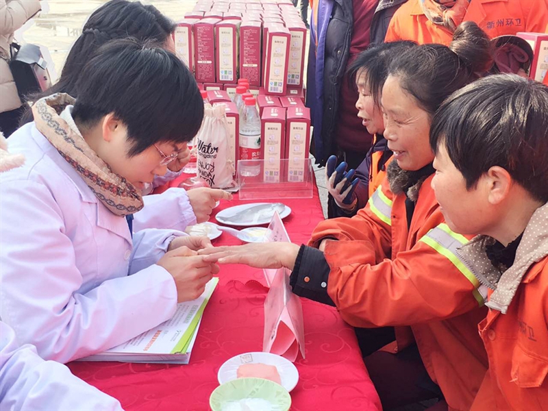 ??? 1月23日上午,南湖廣場上雖然寒風(fēng)凌冽,但是衢州市人民醫(yī)院營養(yǎng)科和護(hù)理部的醫(yī)務(wù)工作者們卻把暖暖的新年祝福送到了環(huán)衛(wèi)工人手中。