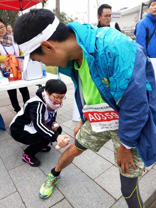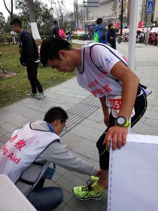 ??? 早上7::15分我院的救護人員就抵達救護點。當比賽進入到1小時07分左右,冠軍產(chǎn)生。隨后運動員們陸續(xù)抵達終點。多名運動走進我院的1號、2號醫(yī)療點。 “醫(yī)生,小腿肌肉抽痛……”;“醫(yī)生,腳踝拐了……”;“醫(yī)生,氣透不上來……”。醫(yī)療人員開始忙碌起來。一位來自金華的年輕跑友,呼吸急促、面色蒼白、大汗淋漓的由志愿者攙扶著來到我們1號醫(yī)療救助站,自訴胸悶、全身無力,救護人員立即給予半坐位、吸氧,評估生命體征。10分鐘左右他自覺癥狀有好轉(zhuǎn),強烈要求與其他跑友一同離開,剛起身一陣頭暈?zāi)垦?,急診醫(yī)生徐小良再次評估后匯報醫(yī)療救助總指揮部,該跑友被救護車護送至我院急診科,全面診治,查血氣分析提示血鉀3.2mmol/l,立即予對癥治療,1小時后復查血鉀4.18mmol/l,恢復良好。賽事結(jié)束,醫(yī)療點救護人員還特意去看望該名跑友,告訴他如果當時離開可能存在的風險,小伙子由起初的一臉驚愕,最后舒心的給我們說了句“謝謝”。