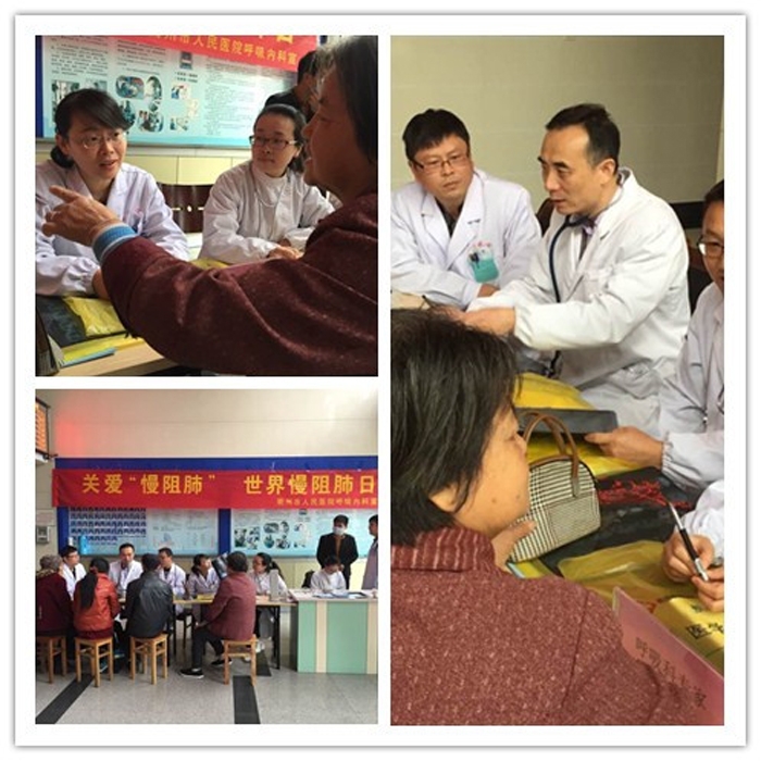 ??? 此次義診,田明慶主任和陸芳主治醫(yī)師認真細致地為近三十名呼吸系統(tǒng)疾病患者看診,其中以慢阻肺居多,詳細講解了慢阻肺的相關(guān)知識,并給出合理的建議和治療方案。護士現(xiàn)場耐心地示范各種吸入劑的使用,呼吸功能鍛煉的方法,宣傳控?zé)熤匾浴2榍皝砭驮\的患者及家屬發(fā)放了宣教資料。隨后,一行人來到了航埠衛(wèi)生院的呼吸科病房,為住院患者進行會診及健康宣教。