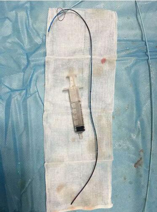 ??? 手術(shù)遇到了艱巨的挑戰(zhàn),需更改手術(shù)方案。血管外科專家王李華教授及陸煒主任短暫商討后,臨時施妙招,先將PICC導管拉出心臟,再將圈套器牽引導管至下腔靜脈,捕捉后緩慢拉出體外,導管竟長達30cm(見圖2)。