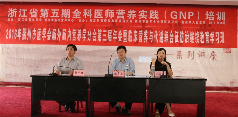 ??? 10月28日—30日,浙江省第五期全科醫(yī)師營養(yǎng)實踐(GNP)培訓(xùn)、衢州市醫(yī)學(xué)會腸外腸內(nèi)營養(yǎng)學(xué)分會學(xué)術(shù)年會暨市級繼續(xù)醫(yī)學(xué)教育項目《臨床營養(yǎng)與代謝綜合征防治》培訓(xùn)班在我院五樓學(xué)術(shù)報告廳舉行,來自全市臨床及相關(guān)的營養(yǎng)工作同仁100余人參加了培訓(xùn)班。
