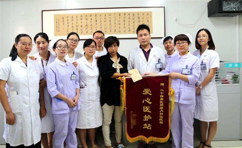 ??? 據(jù)悉,腫瘤內(nèi)科已多次為貧困患者組織募捐,去年12月,科主任鄭勤紅及護(hù)士長(zhǎng)張小芳組織科室醫(yī)務(wù)人員在為癌癥患者謝冬蓮舉行愛心義賣臍橙,籌集愛心款四萬多元。通過愛心傳遞,讓社會(huì)更多愛心人士參與進(jìn)來,一起幫助這些貧困患者度過難關(guān);同時(shí)也鼓勵(lì)患者積極與病魔作斗爭(zhēng),增加他們抗癌的信心。一直以來,腫瘤內(nèi)科醫(yī)護(hù)人員將“恪盡職守,善待病人”的服務(wù)理念轉(zhuǎn)化為“四心”活動(dòng),即熱心助人、細(xì)心查房、耐心問診、貼心服務(wù),受到了患者及家屬一致好評(píng)!