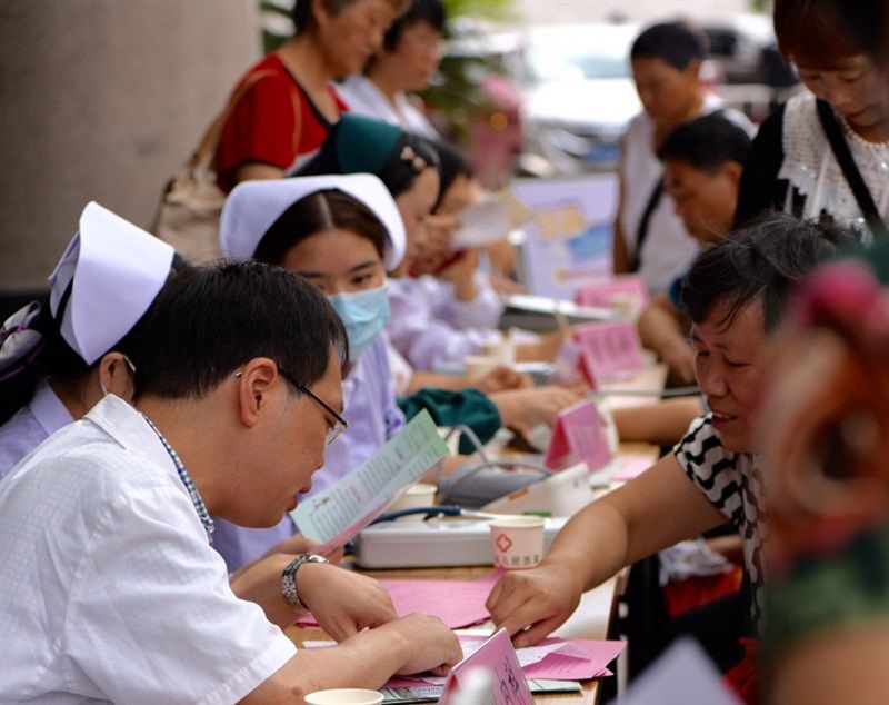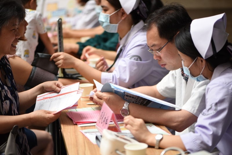 ??? 醫(yī)護人員對前來咨詢的市民進行健康宣教