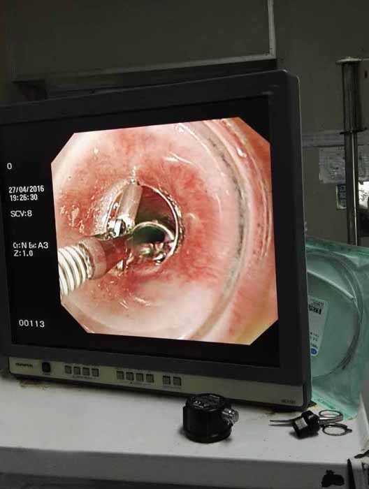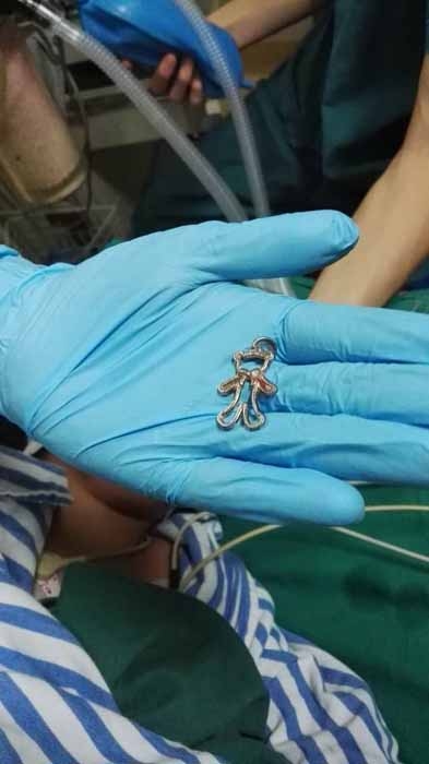 ??? 半個(gè)小時(shí)左右,這枚讓人揪心的金屬小熊被內(nèi)鏡室醫(yī)生順利取出,金屬小熊寬約2CM,高約4-5CM。
