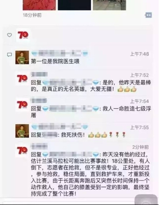 ??? “18公里處,有人倒下,正好他經過參與搶救,穩(wěn)住局面,直到救護車來,才投入比賽。由于長距離奔跑后又突然長時間保持一個動作救人,他自己的膝蓋收到一定的影響,最終堅持完成了整個比賽!”