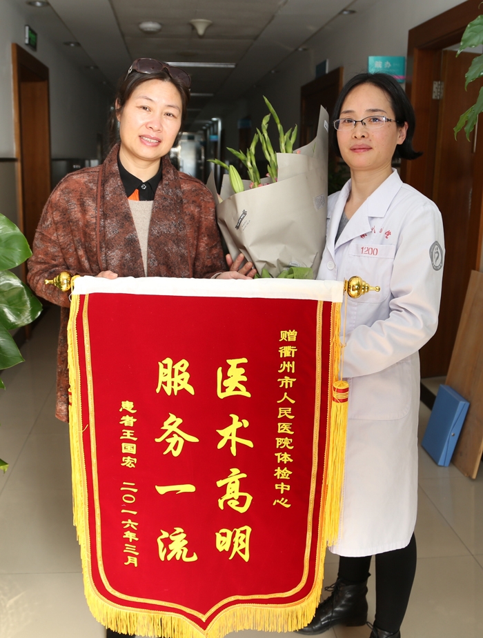 ??? “十分感謝趙醫(yī)生,是她的認(rèn)真細(xì)致發(fā)現(xiàn)了我身上潛在的定時(shí)炸彈,讓我及時(shí)得到了治療……”3月1日下午,王女士捧著鮮花和錦旗來(lái)到衢州市人民醫(yī)院,專程來(lái)感謝曾為她診斷出疾病的B超室醫(yī)生趙中洪。