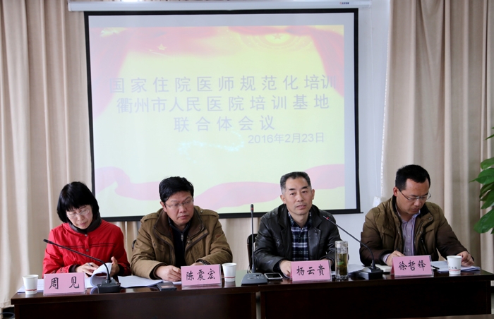 ??? 2月23日上午,國家住院醫(yī)師規(guī)范化培訓(xùn)基地聯(lián)合體工作會議在我院順利召開,市衛(wèi)計(jì)委黨委副書記楊云貴、市醫(yī)學(xué)學(xué)術(shù)管理中心主任徐哲鋒、市人民醫(yī)院、市第三醫(yī)院、衢化醫(yī)院、江山我院、龍游縣人民醫(yī)院、常山縣人民醫(yī)院、開化縣人民醫(yī)院等七家醫(yī)院的分管院長,科教、財(cái)務(wù)等相關(guān)負(fù)責(zé)人,以及我院專業(yè)基地相關(guān)負(fù)責(zé)人參加了會議。會議由院黨委副書記周見主持。