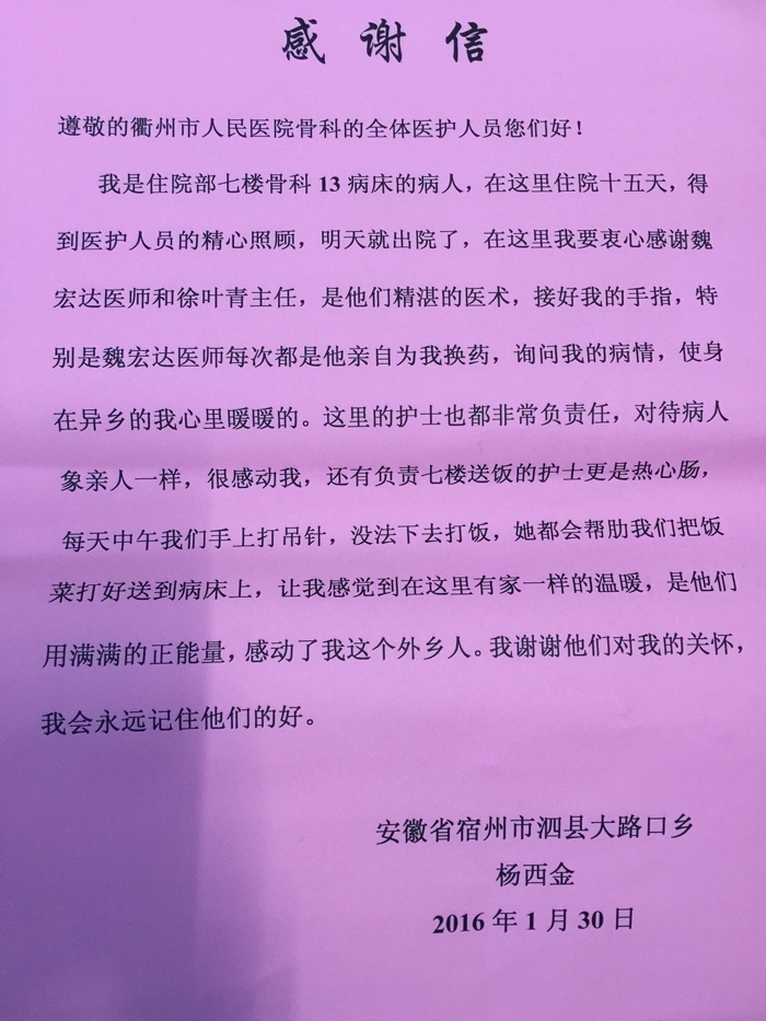 ??? 近日,骨科七病區(qū)病房里收到一封來自外鄉(xiāng)患者的感謝信,據(jù)悉,該患者是骨科七病區(qū)13床的病人,因左手中指骨折在我院骨科接受治療,住院15天,得到了醫(yī)務(wù)人員的精心照顧。醫(yī)生和護(hù)士的真誠(chéng)態(tài)度,讓他感覺到這里有家一樣的溫暖,為感謝骨科醫(yī)生、護(hù)士及醫(yī)院營(yíng)養(yǎng)科的周到服務(wù),特此寫了一封感謝信表達(dá)謝意。