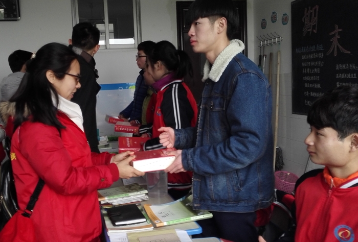 ??? 為積極響應團市委在全市開展的“志愿者在您身邊”新春送溫暖志愿服務主題實踐活動,1月20日我院團員志愿者來到了市特殊教育學校,為該校的學生們送去了《現(xiàn)代漢語詞典》,與同學們愉快地溝通交流、互換聯(lián)系方式,收集、領取了他們的微心愿,并與該校高三(1)班的學生結對。