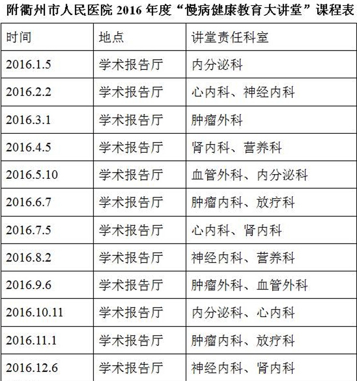 ??? 全市首家,固定場地(五樓學術報告廳)、固定時間(每月一次、每次2節(jié)課)、常年舉辦的面向市民的健康大課堂—我院慢病健康教育大課堂,從2016年1月5日起開講。為給廣大患者提供更全面的服務,我們將邀請各科室資深專家為大家?guī)硪幌盗幸暵犑⒀纾F(xiàn)場進行體格檢查及豐富多彩的互動游戲、提供精美禮品,歡迎感興趣的患者及市民朋友前來參加!