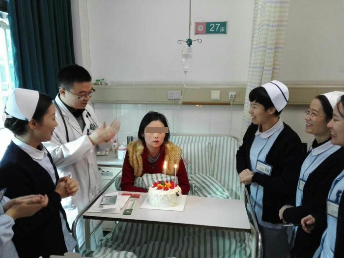 ??? “葉蕾(化名),您感覺好些了嗎?今天精神狀態(tài)還不錯(cuò)哦!”,12月3日一早,我院血液科呂紅姣護(hù)士長(zhǎng)帶領(lǐng)科室醫(yī)護(hù)人員來到了患者葉蕾床前,正當(dāng)病人和家屬以為這只不過是一次例行查房時(shí),主管醫(yī)師王剛提著生日蛋糕,輕輕來到病床前。