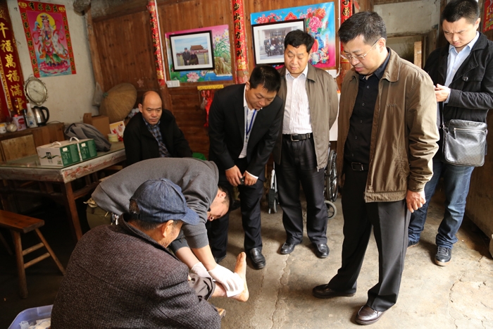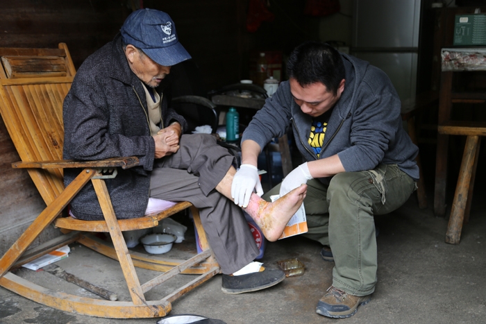 ??? 隨后,劉丙瑞一行帶領萬少華總隊隊長、我院普外科醫(yī)生金晶等醫(yī)護人員來到柯城九華鄉(xiāng)塢口村看望“爛腳病人”魏洪福老人。據(jù)悉,老人曾于2014年9月2日去北京解放軍307醫(yī)院治療(手術植皮),住院110天,不能完全愈合而出院。專家此次前來,特地了解病人的恢復情況并作換藥指導,在現(xiàn)場,金晶重新將魏洪福的傷口進行了清理、治療、包扎。專家們的認真和親切,讓老人感動不已。