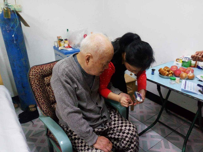 為趙大爺測量血糖,胡朝暉根據(jù)大爺?shù)难乔闆r,更改了胰島素的注射劑量,并交代了一些注意事項。
