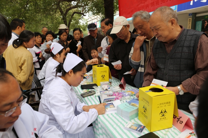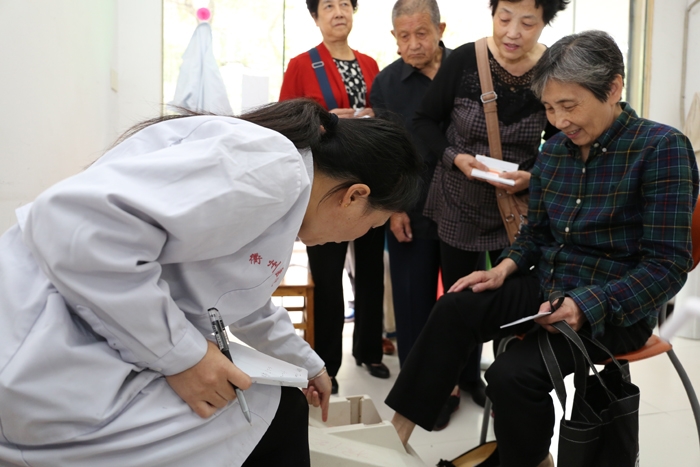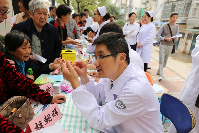 ??? 在斗潭社區(qū)衛(wèi)生服務(wù)站門前的活動(dòng)現(xiàn)場一早就排起長長的隊(duì)伍,我院內(nèi)分泌代謝病科近20余位醫(yī)護(hù)人員為斗潭社區(qū)居民免費(fèi)測量血壓、血糖、血脂、尿酸,進(jìn)行骨質(zhì)疏松風(fēng)險(xiǎn)評估,并為60周歲以上老人免費(fèi)測骨密度,耐性細(xì)致地解答社區(qū)居民的咨詢。