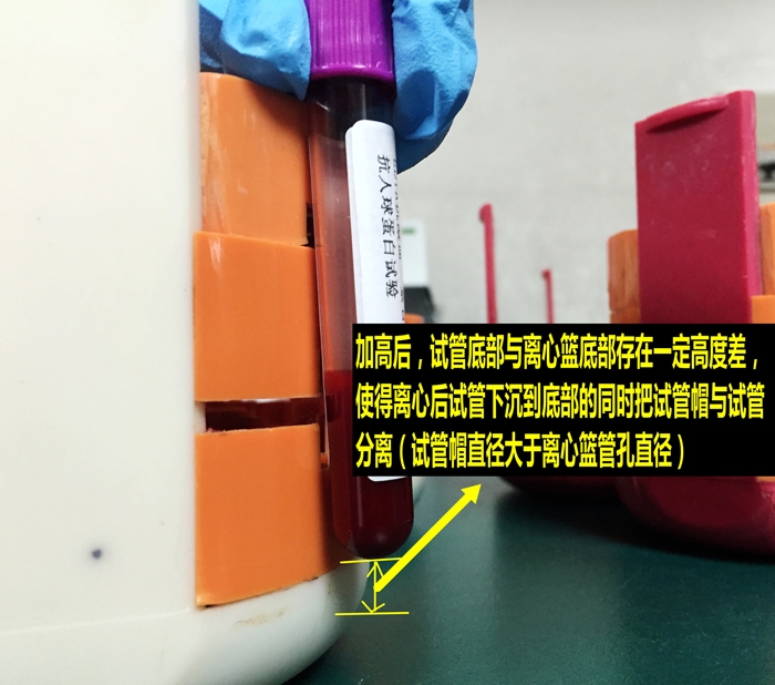 ??? 這一棘手的問題一直被檢驗(yàn)科陳芳建主任、余秋明等同事看在眼里記在心上。在空余時(shí)間,他們對離心籃的脫蓋原理精心研究,反復(fù)測量計(jì)算,多次嘗試,終于找到門道,必須將離心籃進(jìn)行改進(jìn)一一墊高,改造“工程”就這樣開始了。
