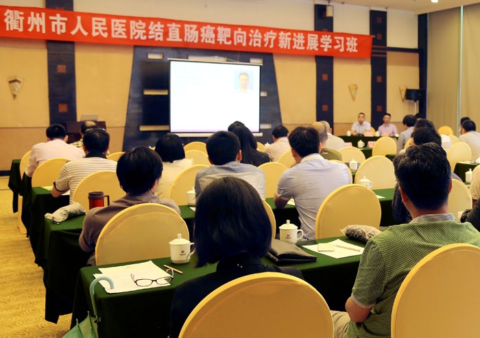 ??? 6月14日上午,我院腫瘤內(nèi)科舉辦的《結(jié)直腸癌靶向治療新進(jìn)展》學(xué)習(xí)班在東方大酒店召開。全市腫瘤專業(yè)醫(yī)師共120余人參與會議。浙江省抗癌協(xié)會秘書長吳揚,衢州市人民醫(yī)院副院長廖小方出席會議并講話。