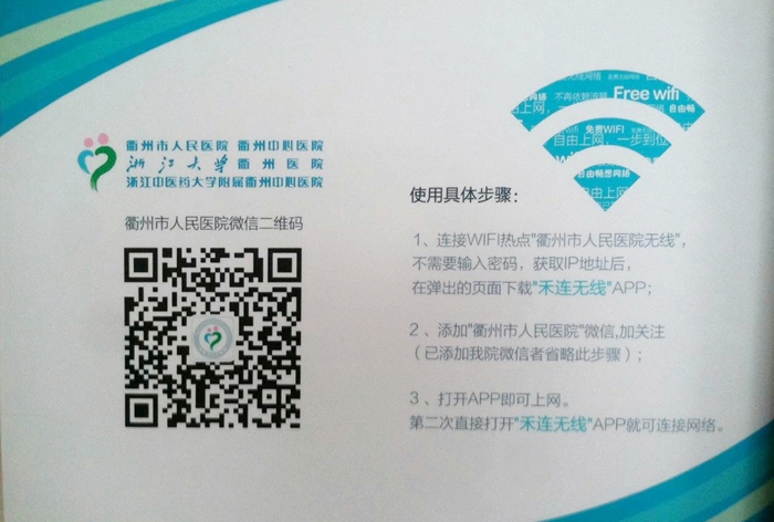 在 WiFi無(wú)線網(wǎng)絡(luò)服務(wù)下,患者及家屬可通過(guò)智能手機(jī)搜索無(wú)線局域網(wǎng)“衢州人醫(yī)免費(fèi)無(wú)線”連接之后,打開(kāi)瀏覽器下載“禾連無(wú)線”App,添加衢州市人民醫(yī)院微信公眾號(hào)并關(guān)注,即可進(jìn)行高速上網(wǎng)。wifi使用專(zhuān)用網(wǎng)絡(luò),IP地址清晰,網(wǎng)絡(luò)安全有保障,能提供更好地上網(wǎng)體驗(yàn),營(yíng)造了利于減壓的候診環(huán)境,有效緩解了患者及家屬等待的焦躁情緒。