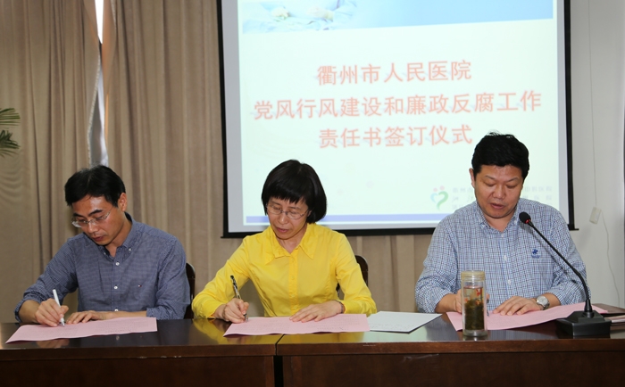 院長陳震宏、黨委書記徐天才與黨委副書記周見簽訂《衢州市人民醫(yī)院2015年黨風行風建設和廉政反腐工作責任書》