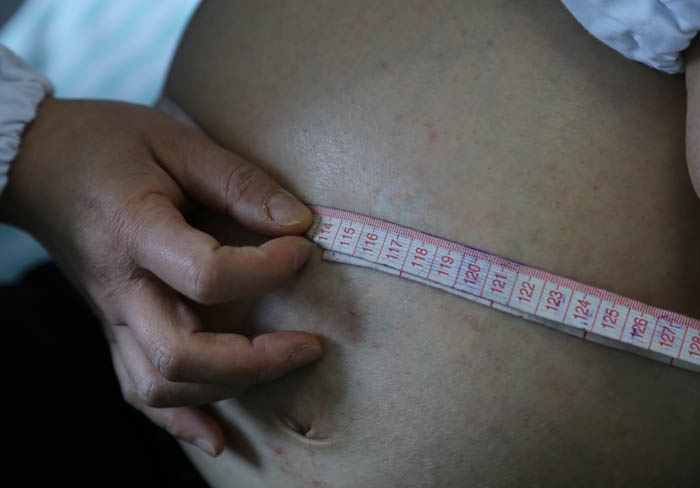 婦科主任醫(yī)師夏麗花為患者測(cè)量腹圍
