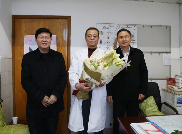 ??? 李鋒向黃強(qiáng)送上了一束精美的鮮花,并致以了親切的問候和新春的祝福。他詳細(xì)了解了黃強(qiáng)的工作、生活情況及未來(lái)對(duì)神經(jīng)外科建設(shè)發(fā)展的愿景,并鼓勵(lì)黃主任在工作崗位上繼續(xù)發(fā)揮特長(zhǎng)和學(xué)術(shù)帶頭作用。