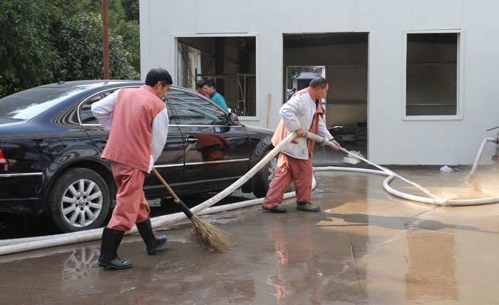 ??? 醫(yī)院外科大樓前剛完工的臨時建筑用房附近灰塵、沙石較多,保潔人員選擇了此處作為衛(wèi)生大掃除的第一站。大家使用水槍、掃帚等工具,沒過多久就將臨時建筑房附近的衛(wèi)生打掃干凈。