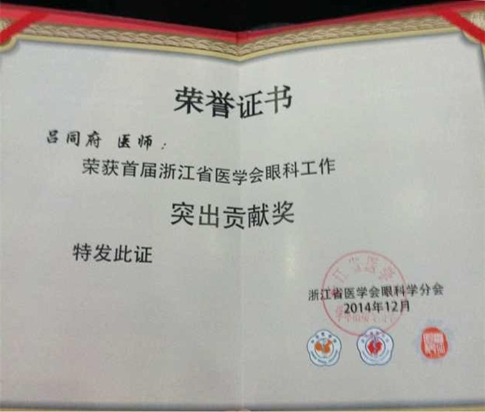 呂同府醫(yī)師榮獲首屆“浙江省醫(yī)學(xué)會(huì)眼科工作突出貢獻(xiàn)獎(jiǎng)”證書