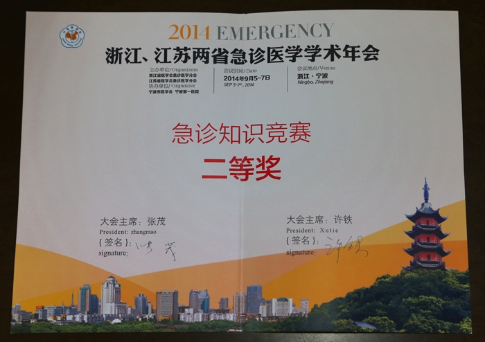 ????9月5日,我院急診科余春燕醫(yī)師代表衢州隊,參加浙江省第一屆急診醫(yī)學知識競賽榮獲二等獎。