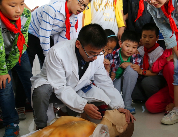 ?? “咦,護(hù)士姐姐,我這樣按壓對不對”、“護(hù)士姐姐,我這力氣夠大了嗎”“醫(yī)生叔叔,我打電話120該怎么說呀”……在新華小學(xué)五樓技能實(shí)驗(yàn)室里同學(xué)們爭先恐后地提出各種問題。