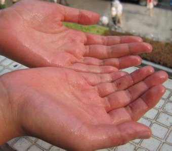 ??? 手汗癥是指正常生活環(huán)境和條件下雙手異常多汗,主要表現(xiàn)為手掌總是濕漉漉的,甚至如出水狀?;颊呤植咳菀酌撈?,有礙觀瞻,顏面潮紅,足底、腋下多汗,炎熱、情緒緊張時可加重。大多是交感神經(jīng)過度興奮引起的,另外,部分甲狀腺功能亢進、糖尿病及精神障礙等系統(tǒng)性疾病患者會發(fā)生繼發(fā)性手汗癥,手汗癥患者以原發(fā)多見。男女都可發(fā)病,多見兒童期,有家族遺傳性,青春期時癥狀明顯。部分患者伴有足底、腋下多汗。
