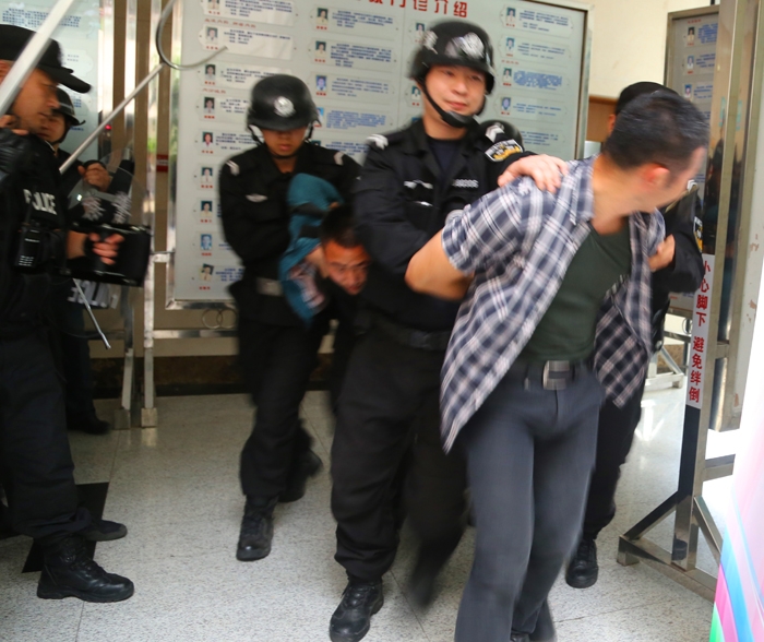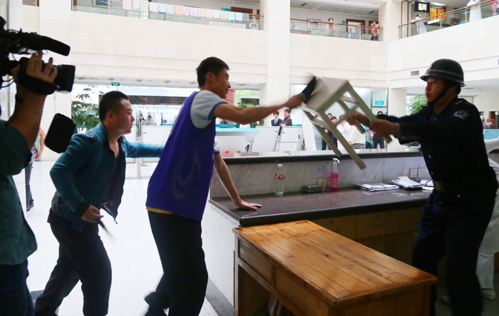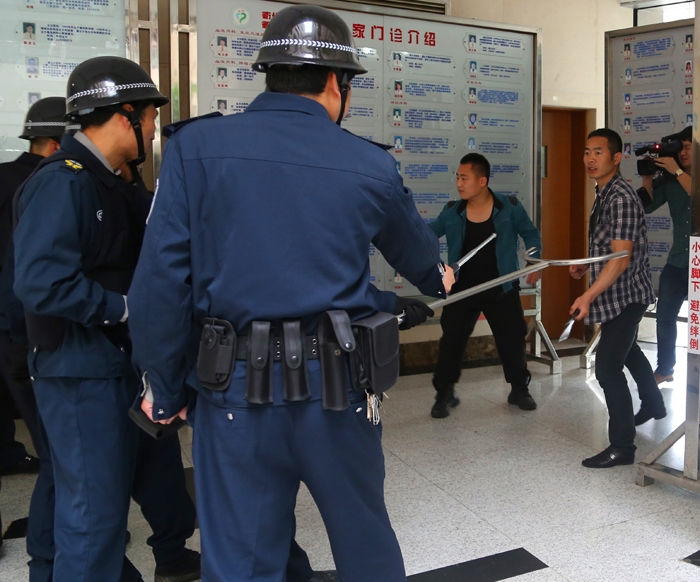 ?? “有歹徒砍人!”4月 11日下午16:30,我院導診臺一名護士高聲喊到。1名在導診臺執(zhí)勤的保安隨即拿起板凳與2名持刀“歹徒”搏斗,另1名“歹徒”沖向掛號處,在掛號處執(zhí)勤的保安一邊用隨身攜帶的警棍與“歹徒”搏斗,一邊用對講機呼叫值班室保安增援……