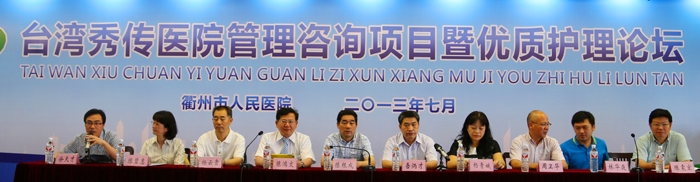 ??? 7月14日上午,衢州市人民醫(yī)院與臺灣秀傳醫(yī)院管理咨詢項(xiàng)目暨優(yōu)質(zhì)護(hù)理管理論壇啟動(dòng)儀式在五樓學(xué)術(shù)報(bào)告廳隆重舉行。臺灣秀傳醫(yī)院行政副院長陳鴻文,教育培訓(xùn)中心主任楊青娥,護(hù)理部主任陳碧惠,秀傳管理咨詢公司、醫(yī)院合作發(fā)展中心執(zhí)行長林華庭,市衛(wèi)生局黨委書記、局長陳根成,市臺辦主任吾炳才,市衛(wèi)生局黨委副書記楊云貴,副局長周衛(wèi)華,市人民醫(yī)院院長陳震宏出席簽約儀式,院黨委書記徐天才主持儀式,我院黨政班子成員、班組長以上干部及部分兄弟醫(yī)院同仁參加了儀式。