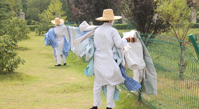 ????談話間,姜阿姨發(fā)現(xiàn)收衣服的時間到了,便戴上草帽,叫上了其他女工一起趕去曬衣場。“我們早上7點半就要到這里,下午5點半下班,中間幾乎沒空閑的時間?!?/DIV>
