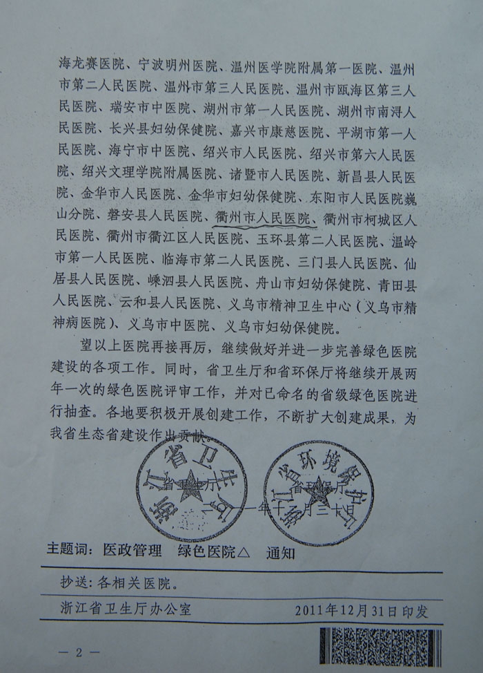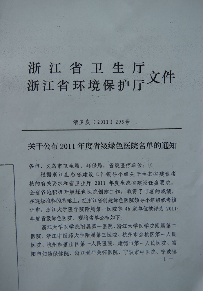 近日,浙江省衛(wèi)生廳和浙江省環(huán)境保護(hù)廳聯(lián)合發(fā)文,公布了浙江大學(xué)醫(yī)學(xué)院附屬第一醫(yī)院等46家單位被評(píng)為2011年度省級(jí)綠色醫(yī)院,我院名列其中。