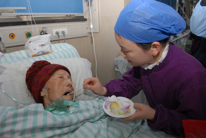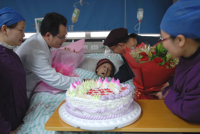 12月21日下午,我院EICU病房里情誼濃濃,該病房的醫(yī)護(hù)人員給90歲的住院病人周文貞送上了蛋糕和鮮花,為老人過(guò)了一個(gè)特別的90大壽。