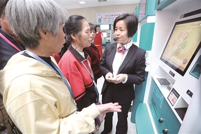 昨日下午,20名衢報傳媒市民觀察團成員走進衢州市人民醫(yī)院、衢州市中醫(yī)醫(yī)院、衢州市婦幼保健院等三家市本級公立醫(yī)院,感受“最多跑一次”改革以來醫(yī)療衛(wèi)生服務領域的新變化。圖為工作人員向觀察團成員介紹新型自助一體機,市民可通過該機器自助完成門診掛號、化驗單打印等業(yè)務。
