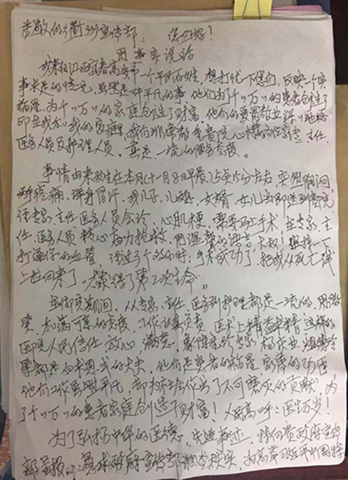 經(jīng)過兩周的精心治療和悉心護(hù)理,沈先生的病情穩(wěn)定,為了表達(dá)謝意,他寫下了這封感謝信,親手交到了護(hù)士長張小芳手中。字里行間流露出患者及家屬對醫(yī)護(hù)人員的信任與感激,對我院心血管內(nèi)科醫(yī)護(hù)團(tuán)隊(duì)精湛的醫(yī)術(shù)以及優(yōu)質(zhì)服務(wù)的極大肯定,更表達(dá)了對衢州這座有禮的城市的贊美!