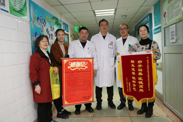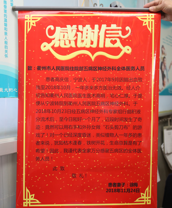 “他現(xiàn)在可以用右手和外孫女做‘剪刀石頭布’的游戲了!”日前,在我院神經(jīng)外科病房,徐女士拿著一封大幅海報(bào)式樣的感謝信和一面錦旗,表達(dá)了對醫(yī)護(hù)人員的感謝。