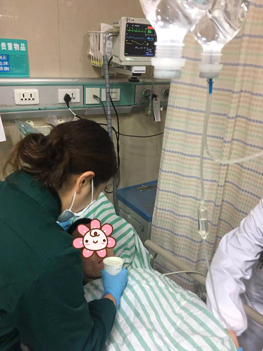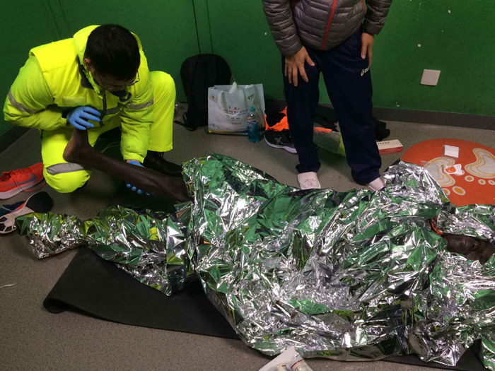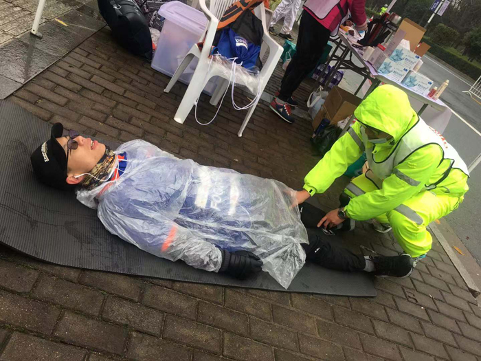9:58,一名24歲的小伙子因腿腳嚴(yán)重抽筋、頭痛送入急診,醫(yī)護(hù)人員馬上投入搶救?;颊咭恢焙袄洌o加蓋了三條被子,19分鐘后停止寒戰(zhàn),情緒穩(wěn)定,還和大家聊起了馬拉松賽事,此時大家懸著的心才放下。