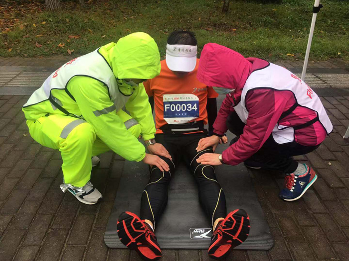 長距離的跑步,導(dǎo)致眾多選手出現(xiàn)肌肉痙攣及肌腱拉傷現(xiàn)象,康復(fù)治療師一邊嫻熟地檢查患處、局部止痛治療,一邊貼心地向運動員交代注意事項。