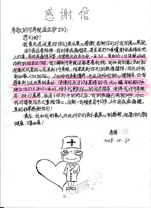 在為戴阿姨服務(wù)的102天的時(shí)間里,她從剛接受服務(wù)時(shí)只能躺在床上,到現(xiàn)在疼痛得以緩解,已經(jīng)可以自行翻身坐起,在輔助下能簡單的步行。戴阿姨的兒子看著母親一步步地好轉(zhuǎn)到安詳離世,真心地感謝醫(yī)護(hù)人員的付出,于是親手制作了一面錦旗。