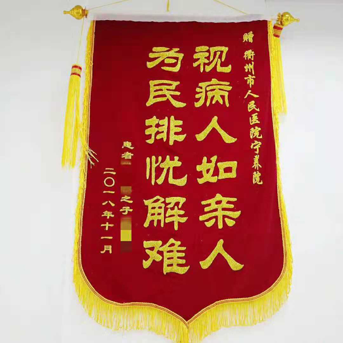 在為戴阿姨服務(wù)的102天的時(shí)間里,她從剛接受服務(wù)時(shí)只能躺在床上,到現(xiàn)在疼痛得以緩解,已經(jīng)可以自行翻身坐起,在輔助下能簡單的步行。戴阿姨的兒子看著母親一步步地好轉(zhuǎn)到安詳離世,真心地感謝醫(yī)護(hù)人員的付出,于是親手制作了一面錦旗。