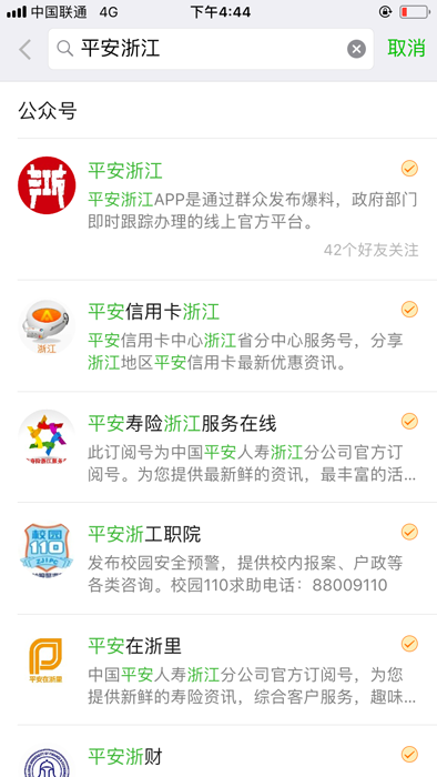 1、在微信中搜索“平安浙江”公眾號(hào)并關(guān)注。